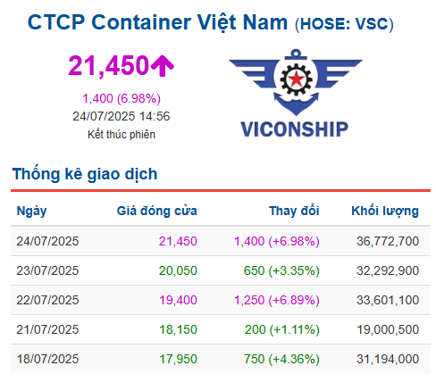 Giá cổ phiếu Viconship (HOSE: VSC) bứt phá mạnh mẽ với 5 phiên tăng liên tiếp, trong đó có 2 phiên tím trần. Phiên 24/07, VSC đóng cửa tại mức 21,450 đồng/cp, chỉ còn cách đỉnh lịch sử đúng 90 đồng, với thanh khoản cao nhất từ trước đến nay.